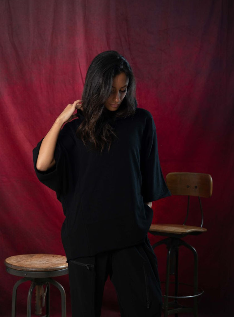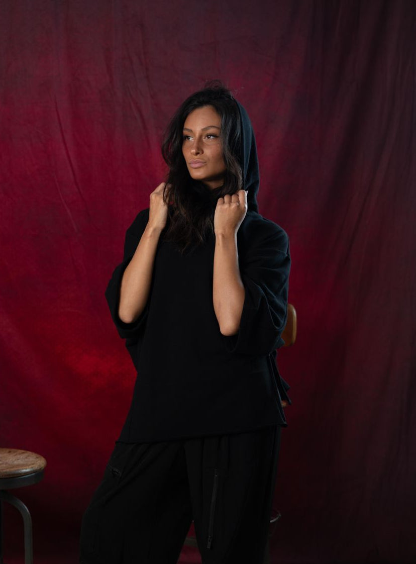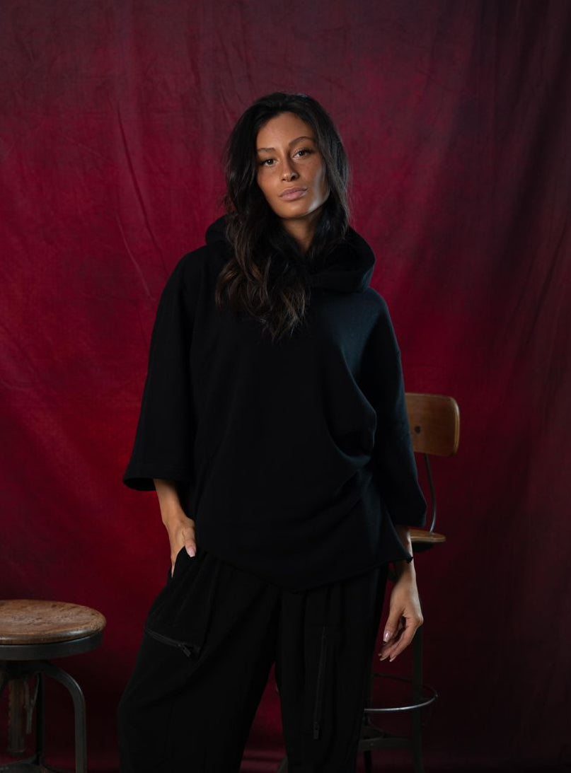 Cappuccio morbido, maniche a tre quarti leggermente ampie.