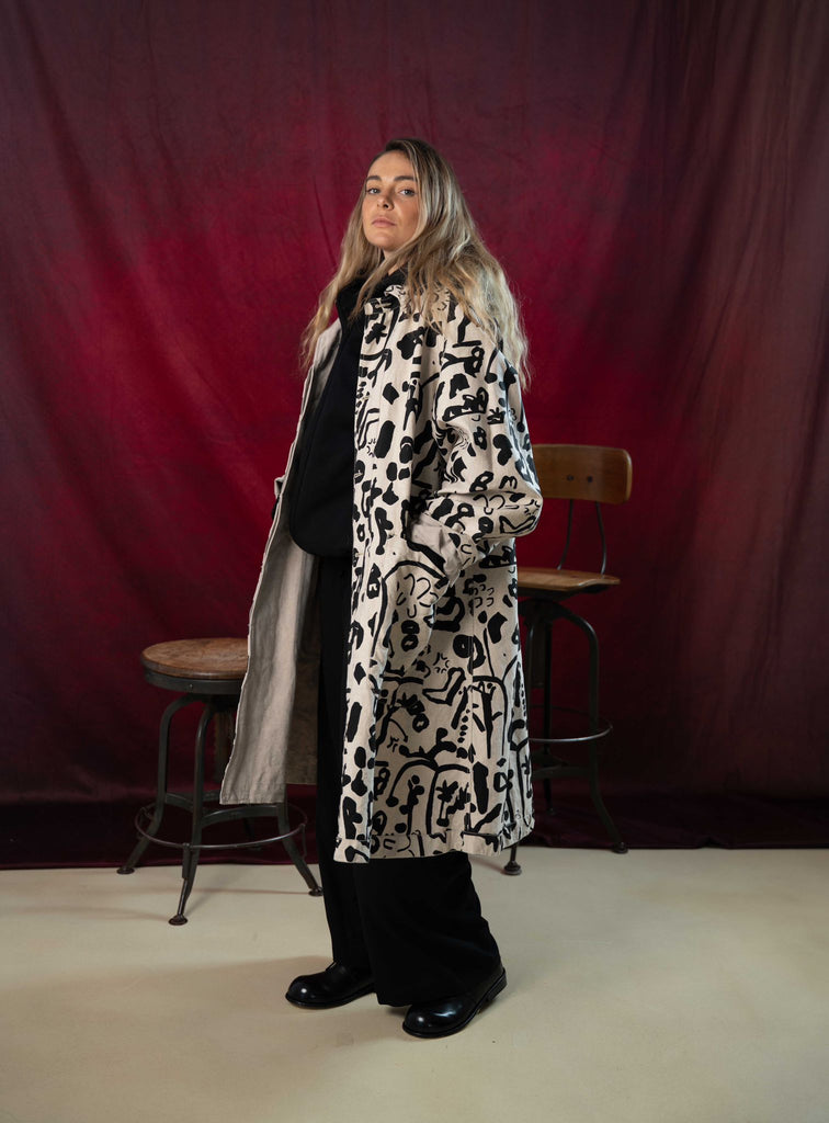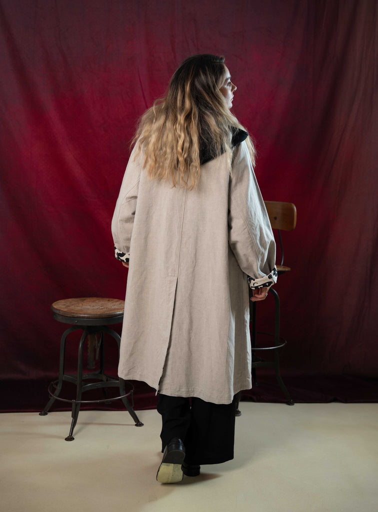 Modello monopetto con bottoni chiari sul lato liscio e bottoni scuri sul lato stampato. Maniche a raglan, linea morbida e fluida, lunghezza midi con spacco posteriore.