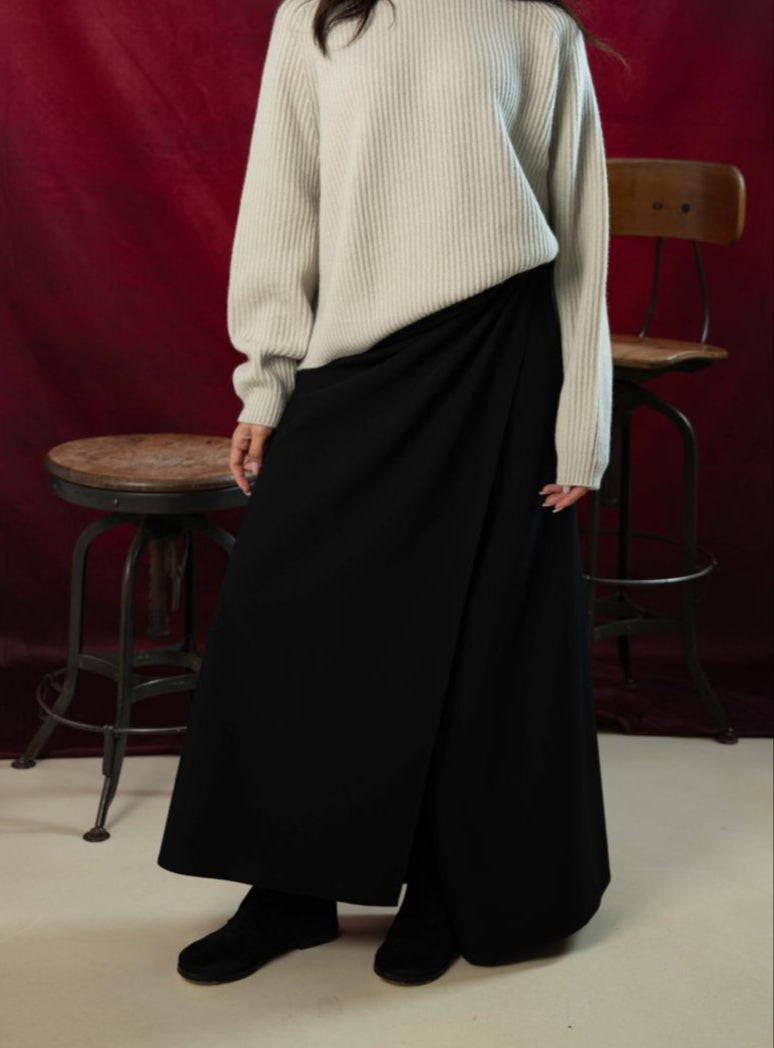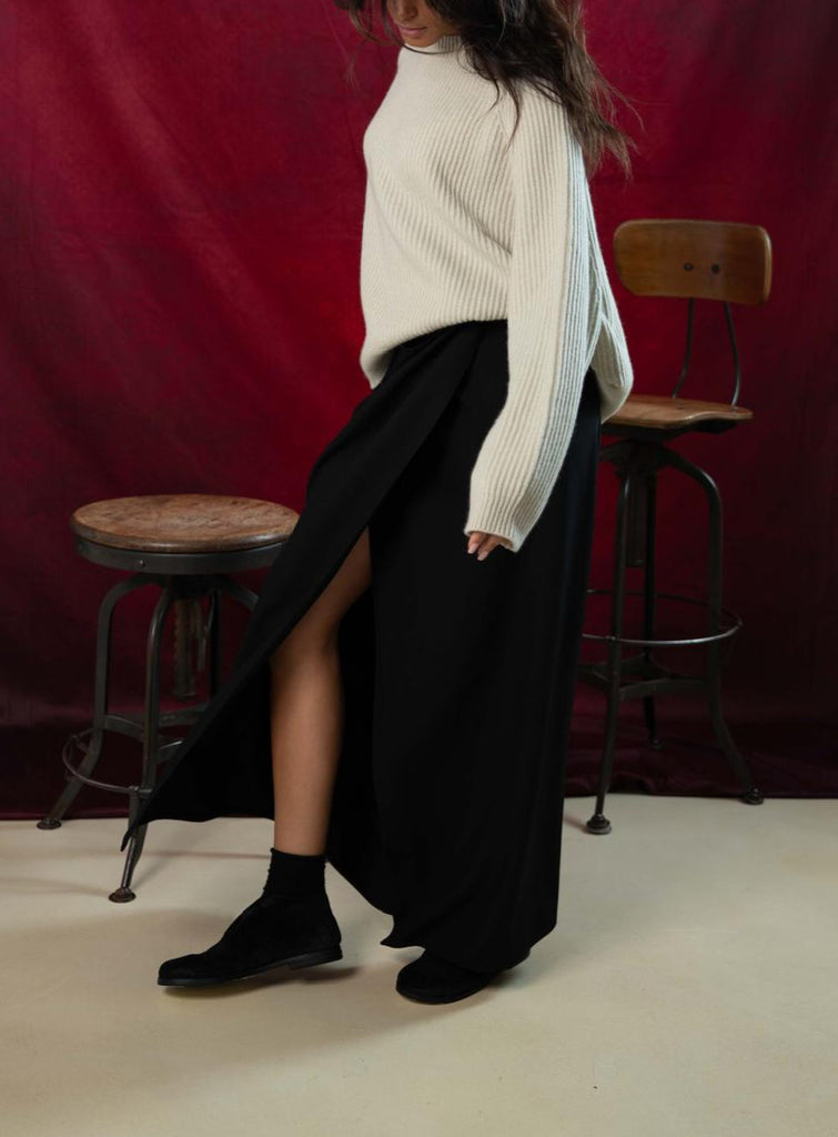 Vita elasticizzata per una vestibilità comoda e versatile. Spacco laterale che aggiunge movimento e leggerezza alla silhouette.