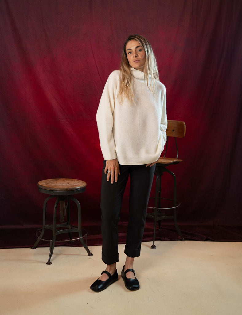 Collo alto morbido, confortevole e avvolgente. Dettagli a punti calati sul davanti e ai lati che aggiungono movimento e ricercatezza.